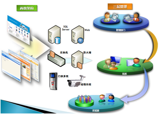 實驗室綜合信息管理平臺采用基于webB/S架構,輔以門禁系統、遠程監控的管理,采用軟、硬件相結合的創新方式實現校級平臺、院系平臺兩級管理。