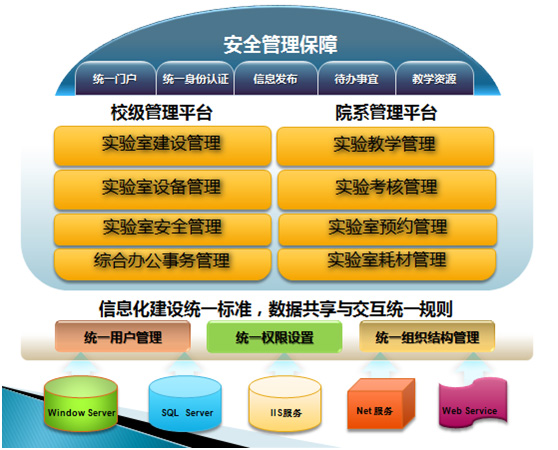 實驗室綜合信息管理平臺整合實驗室管理相關的實各類業務系統和信息服務資源,為學校實驗室管理者搭建一個溝通平臺、協作平臺,為師生提供一個教育資源服務平臺、共享平臺。創新的兩級管理模式,建立校級管理平臺,實現對各個實驗室日常運作的監管,獲取基礎報表數據;實驗物資、實驗建設項目的審批管理;建立實驗室管理平臺,實現符合各院系管理特色的實驗教學業務管理;實現實驗室預約等管理。