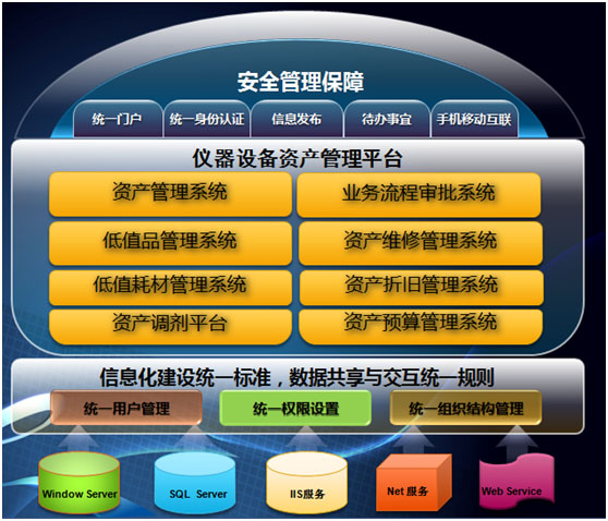資產信息智慧管理平臺采用基于Web的三層B/S架構,接入移動互聯的應用,實現用戶單位對資產的多級管理需求。